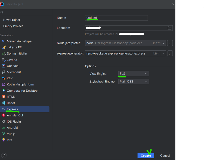 4. Options - View Engine : EJS 설정 후 Create => 설치 완료